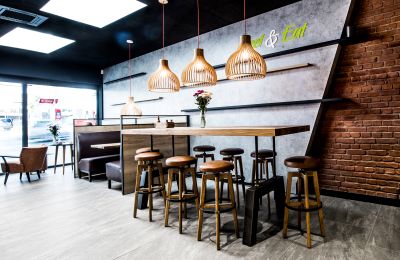 Wie bei einer Bäckerei gilt es, die Ware in der Snacktheke mit Licht zu inszenieren. Ideal sind LED-Lampen in der Theke oder in der Decke mit einem höheren Gelbanteil. Diese lassen die Backwaren noch frischer wirken. Zudem emittieren LED-Leuchten kaum Wärme und trocknen die Backwaren nicht aus. Auch die Rückwand gilt es zu inszenieren: ein Logo, eine schöne Siebträger-Kaffeemaschine, das Menüboard oder ein Brotregal, das Backkompetenz vermittelt.