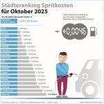 Städteranking der Spritkosten für Oktober 2025. Grafik: infoRoad GmbH / Clever Tanken Im Oktober zahlten Autofahrerinnen und Autofahrer zum zweiten Mal in Folge mehr für Benzin und Diesel – wenn… mehr lesen -